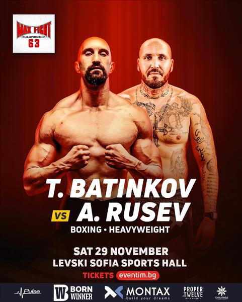 На 29 ноември в зала "Левски София" зрителите ще станат свидетели на епичен сблъсък в тежка категория - Тихомир Батинков срещу Ангел Русев в рамките на MAX FIGHT 63 по правилата на бокса.