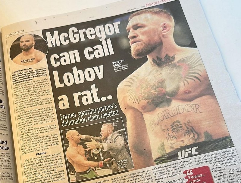 Лобов вече загуби едно дело, което заведе срещу Макрегър за обиди. Сега той го съди за неизплатени печалби от марката уиски Proper No. 12. Лобов твърди, че имал ключов принос за основаването на марката, чиито контролни дялове бяха продадени на Proximo Spirits през 2021 г. за 600 милиона долара.