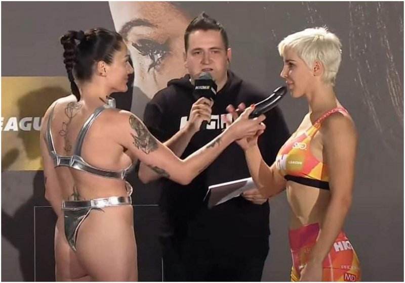 Напрежението между двете се увеличи и те тръгнаха да се бият още преди битката. Бродничка е известна в бокса и е с рекорд 20-1 на ринга. Това беше дебютната й битка в ММА и тя си плати за размахания вибратор.