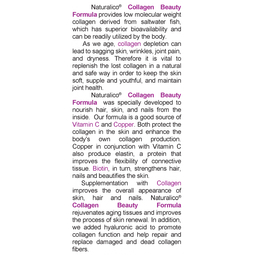 Collagen Beauty Formula на Naturalico® подмладява стареещите тъкани и подобрява процеса на обновяване на кожата. Освен това сме добавили и хиалуронова киселина, за да стимулираме колагеновата функция и да предотвратим натрупването на повредени колагенови влакна, както и да подпомогнем замяната на вече повредени и мъртви такива. Приемът на този продукт подобрява цялостния външен вид на кожата, косата и ноктите.