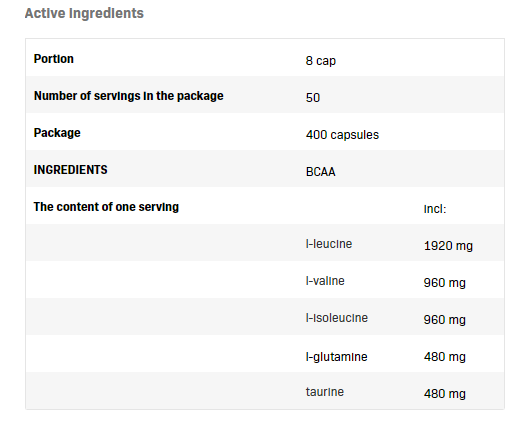 Освен това се препоръчва от диетолози, а допълнителното му предимство е високата усвояемост и атрактивната цена. Аминокиселините с разклонена верига (BCAA) са набор от три аминокиселини (левцин, валин и изолевцин), които заемат специално място в хранителните добавки. Глутамин е една от ендогенните аминокиселини. Допълването на диетата с глутамин се препоръчва от специалистите по хранене, по принцип, за всички, с особен акцент върху активно спортуващите хора. Тауринът е съдържаща сяра непротеинова аминокиселина. Начин на употреба: В тренировъчни дние приемайте 1 доза непосредствено преди тренировка. В нетренировъчни дни приемайте 1 доза сутрин веднага след събуждане.