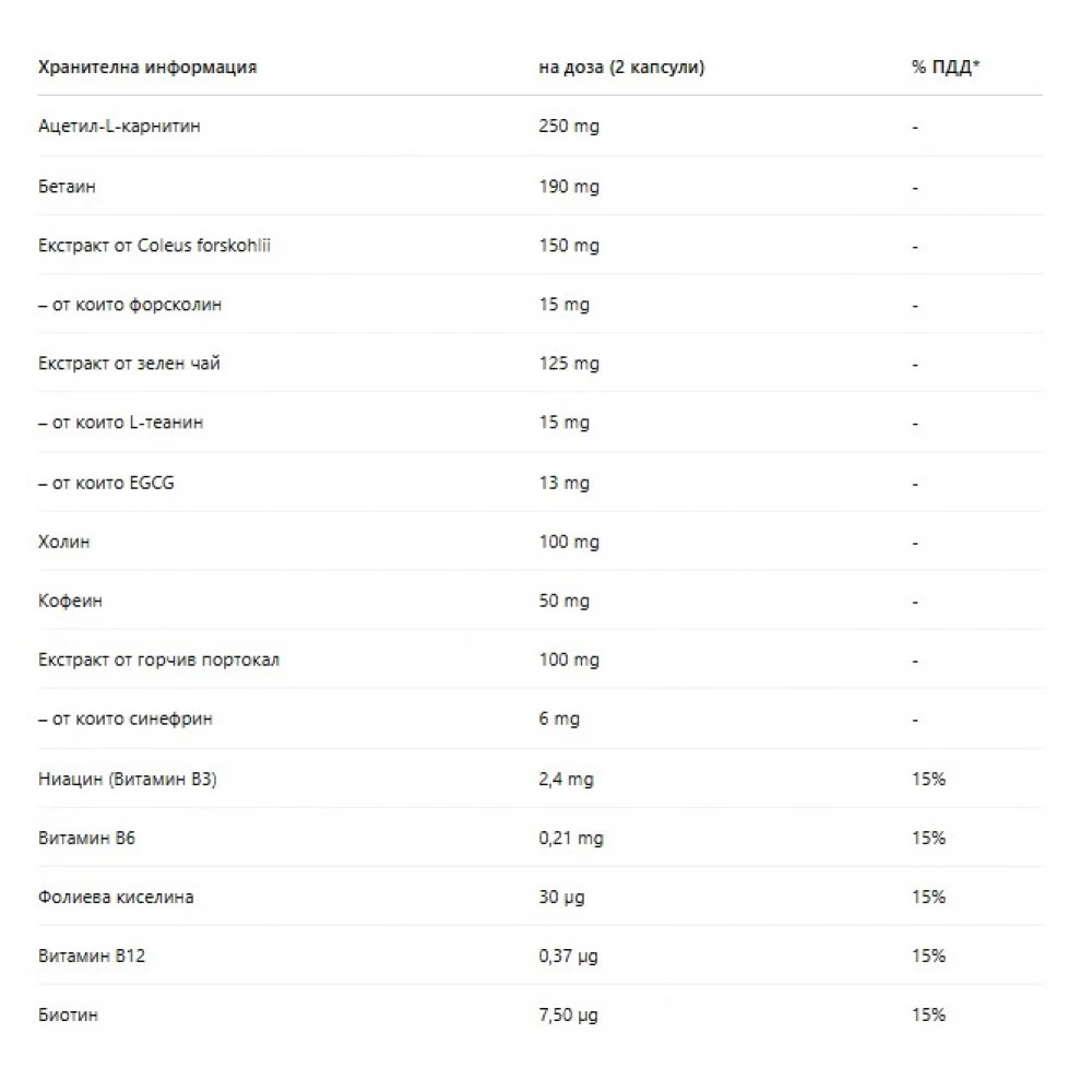 Ацетил-L-карнитин хидрохлорид, бетаин хидрохлорид, DL-холин битартрат, хидроксипропилметилцелулоза (обвивка на капсулата), екстракт от корен на Coleus forskohlii, екстракт от листа на зелен чай, екстракт от плодове на Citrus aurantium (горчив портокал), кофеин,