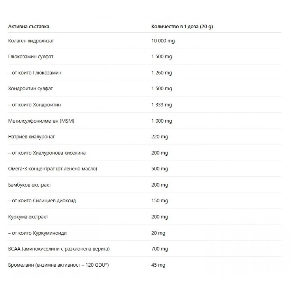 Колаген хидролизат (10 000 mg): Основен структурен протеин в ставите и сухожилията. Подпомага здравината и еластичността на тъканите.