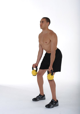 Хванете пудовката с двете ръце и застанете с разтворени на ширината на раменете крака. Приклякайки леко, залюлейте между бедрата си пудовката. Пауза, след което експлозивно се върнете до първоначална позиция, изтласквайки пудовката до нивото на очите.