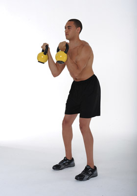 Застанете с разтворени на ширината на раменете крака и задръжте пудовката с двете ръце, на нивото на очите, така че да можете да виждате през дръжката. Дръжте гърба си изправен. Клекнете толква ниско, колкото можете.